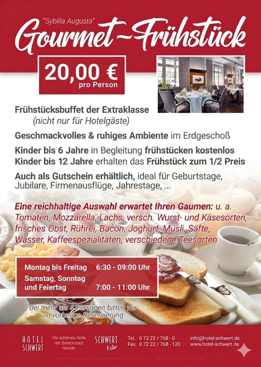 Sie möchten jemandem eine besondere Freude bereiten? Einem Verwandten, Geschäftspartner oder einem Freund? Wir haben das richtige Geschenk für jeden Anlass. Verschenken Sie einen Gutschein für unser köstliches Frühstücksbuffet in unserem Hotel Schwert in Rastatt. Die Gutscheine erhalten sie an unserer Rezeption.